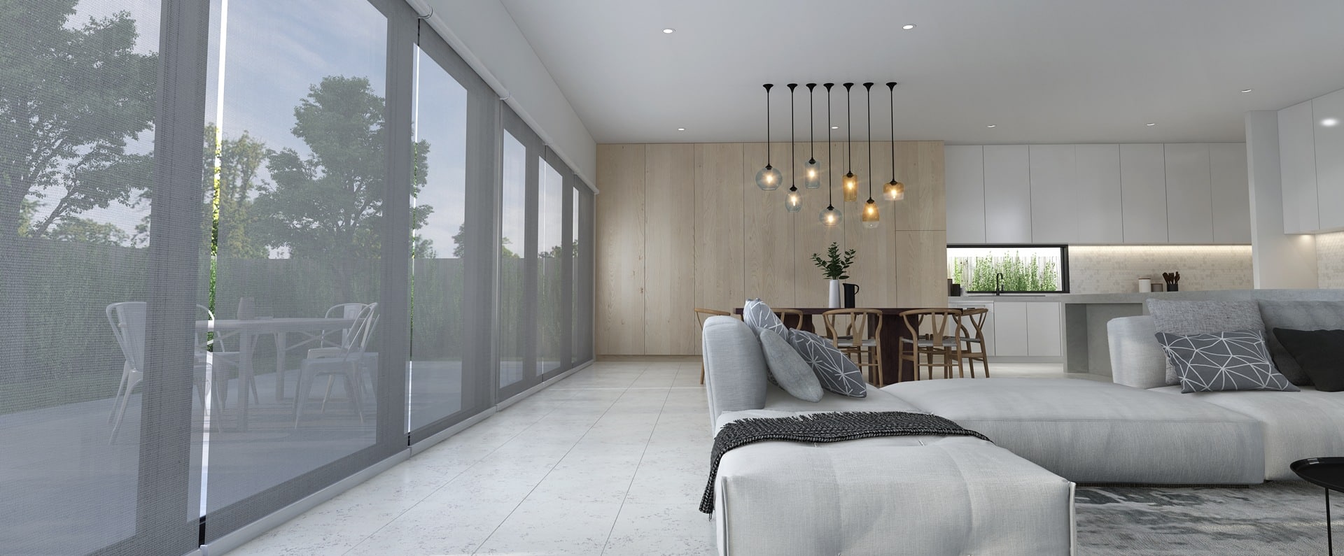 - Dual roller blinds combining blockout and sunscreen fabrics